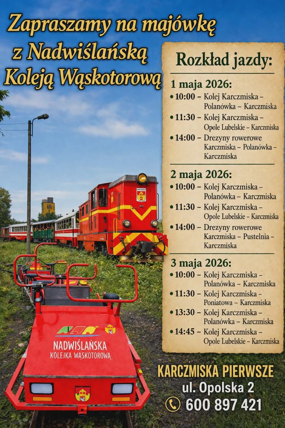 Sezon coraz bliżej! Startujemy już 1 maja ! Zapraszamy do zapoznania się z rozkładem jazdy obowiązującym w 2026 roku, który znajduje się w zakładce rozkład jazdy https://nadwislanskakolejka.pl/rozklad-jazdy-nadwislanskiej-kolejki-waskotorowej/ Przypominamy,że...