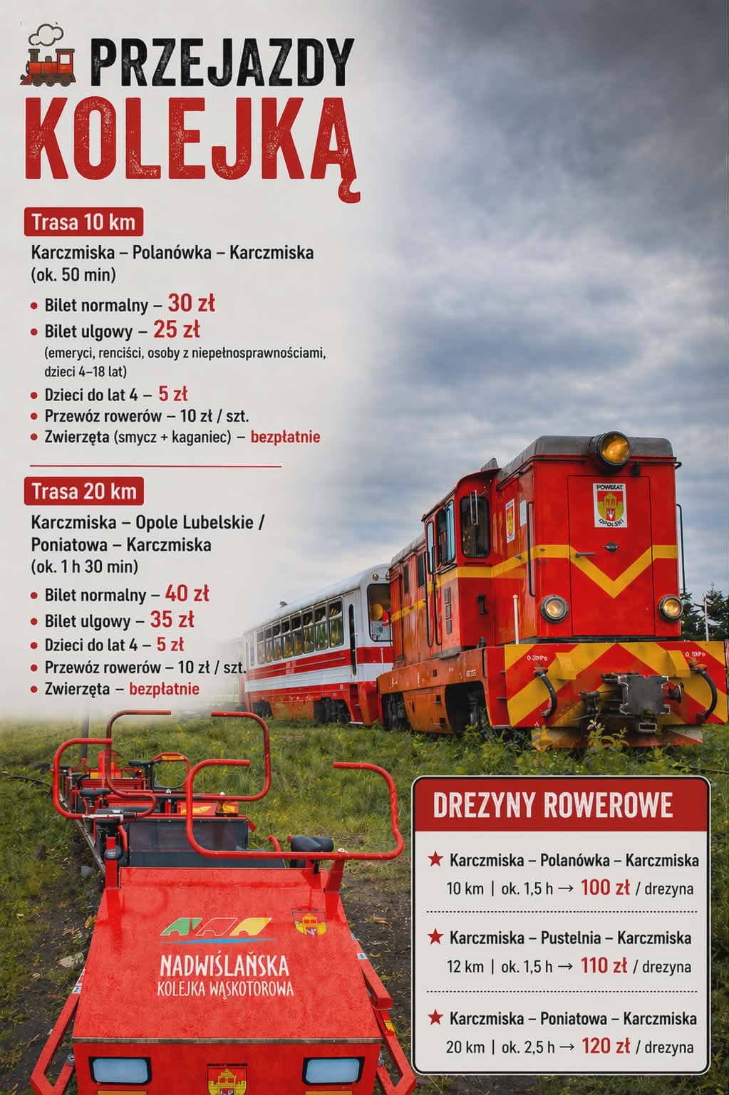 Drezyny – zakup biletów TYLKO w kasie w dniu odjazdu drezyn (wskazana jest wcześniejsza rezerwacja SMS (600 897 421) lub email (bilety@nadwislanskakolejka.pl)